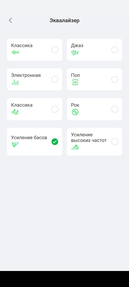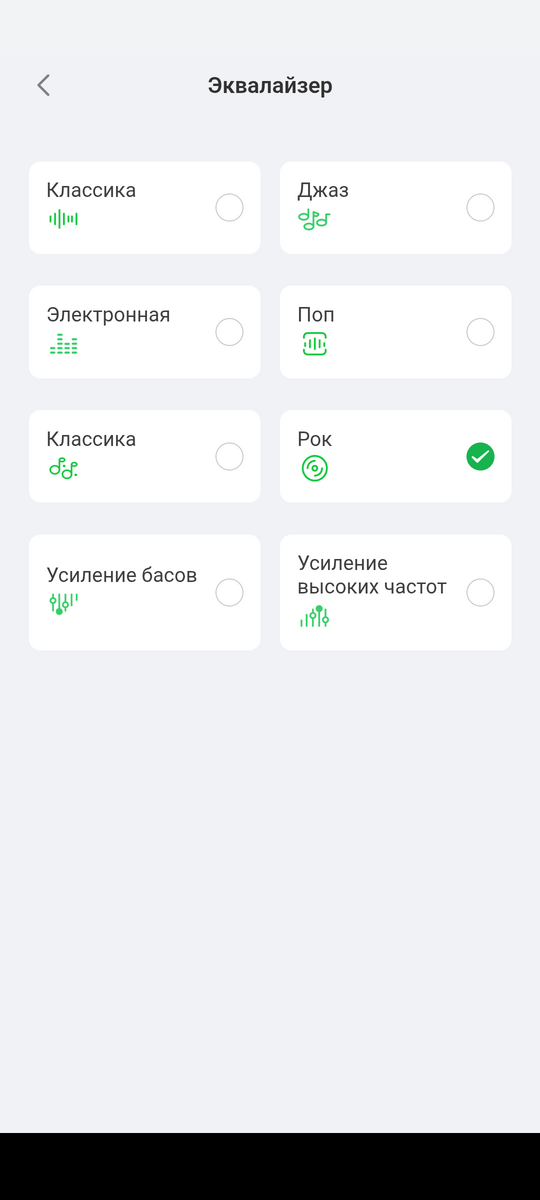 Готовые пресеты эквалайзера — всего 8 пресетов. — Мне понравился пресет «Рок», ещё лучше «Усиление высоких частот».