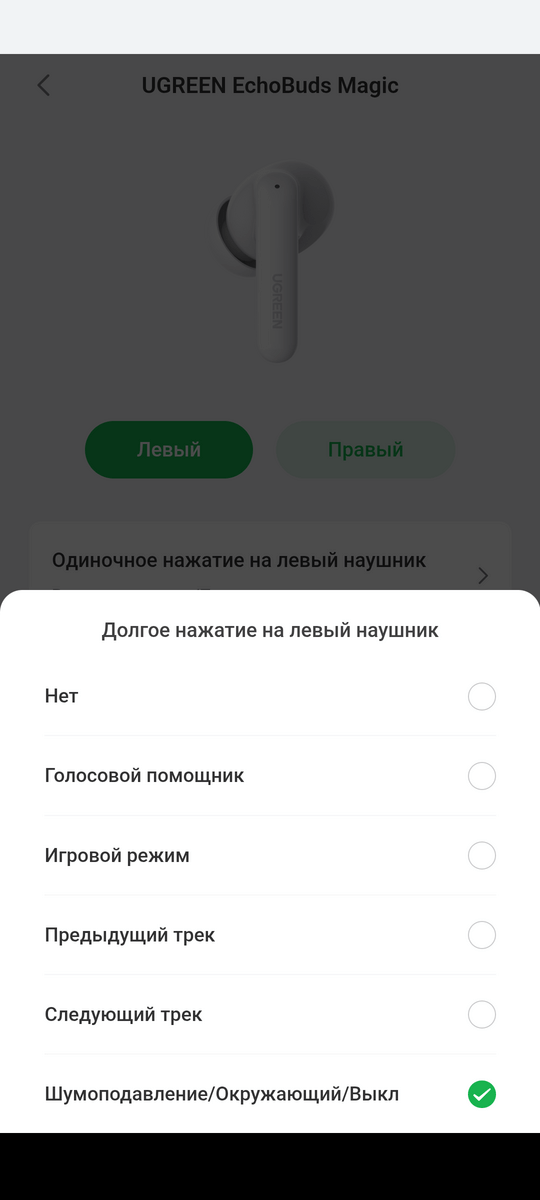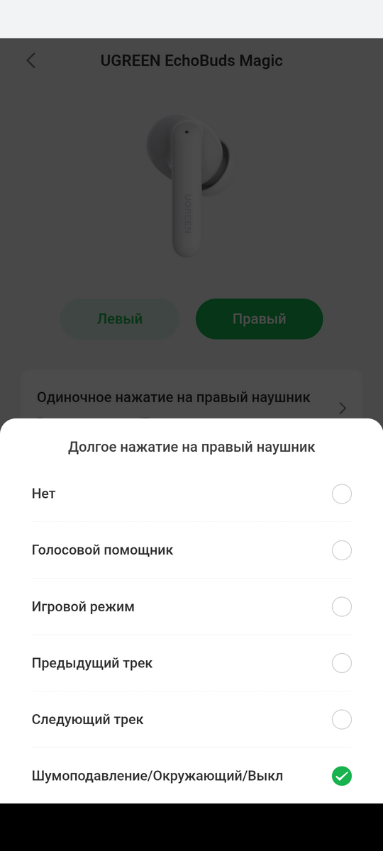 Долгое нажатие: Шумоподавление/Прозрачность/Выкл