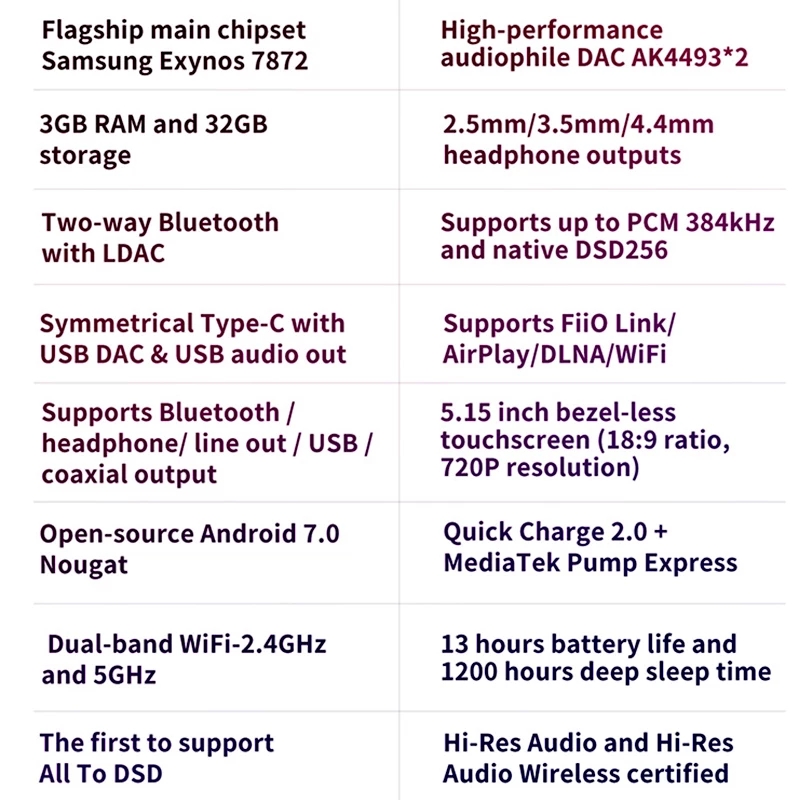 • Нормальная работа с двумя картами памяти (у FiiO X5-III вторая карта отключалась когда плеер засыпал, что приводило к сбрасыванию «очереди»)