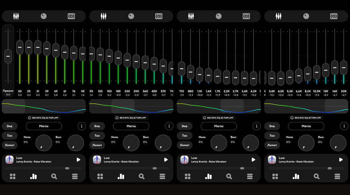 Рекомендация: пресет «мягко» в плеере PowearAMP. Звук получается басовым, с проваленной серединой и не такими резкими высокими. Звучание минимально становится лучше, при этом не такое утомляющее. Пресет «мягко» — хорошая основа для дальнейшей доработки звука, если поднять средние частоты.