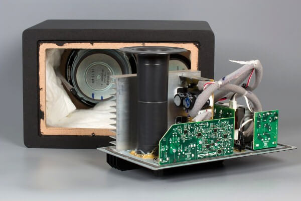 На фото внутренность старшей модели HS7, но технически они ничем не отличаются от HS5. Усилитель монитора класса D с биампингом. Разделение мощности на НЧ 45 Вт, а на ВЧ 25 Вт (при пиковой нагрузке). В усилительном тракте производитель использует две микросхемы LM3886.