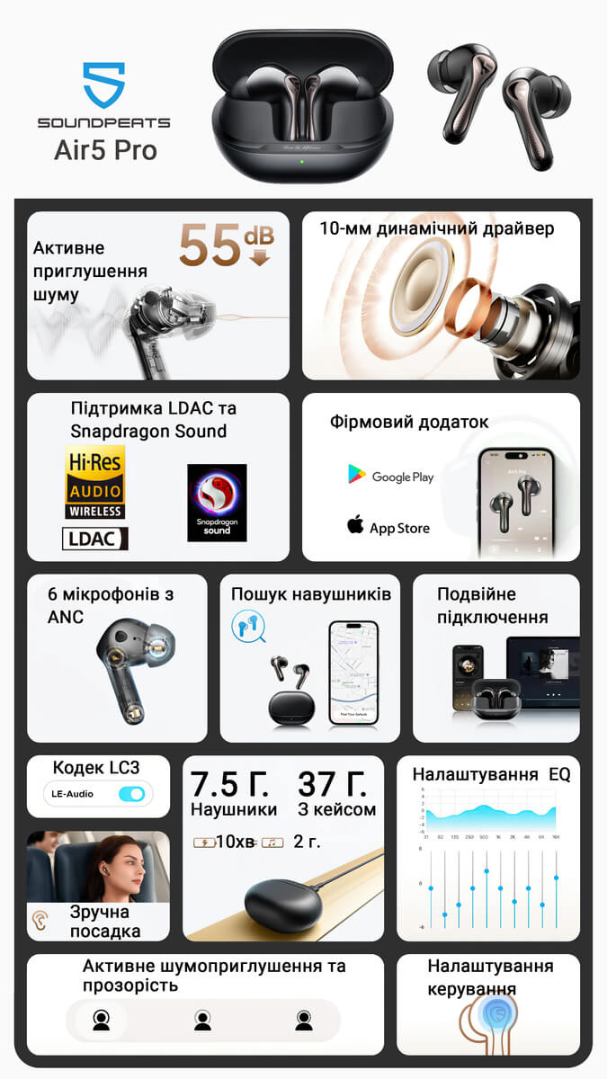 Компанія SOUNDPEATS представила нові TWS навушники — це внутрішньоканальна модель Air5 Pro. Bluetooth навушники вже доступні для замовлення на офіційному сайті та в офіційному магазині на AliExpress. А з 16 червня 2025 року розпочнуться продажі для глобального ринку, якраз під літній розпродаж на AliExpress. З цієї нагоди для вас ми підготували промокоди на знижку — забирайте на головній сторінці Mychooz.com та заощаджуйте. Наступний подібний великий розпродаж буде через 4 місяці, аж 11.11.